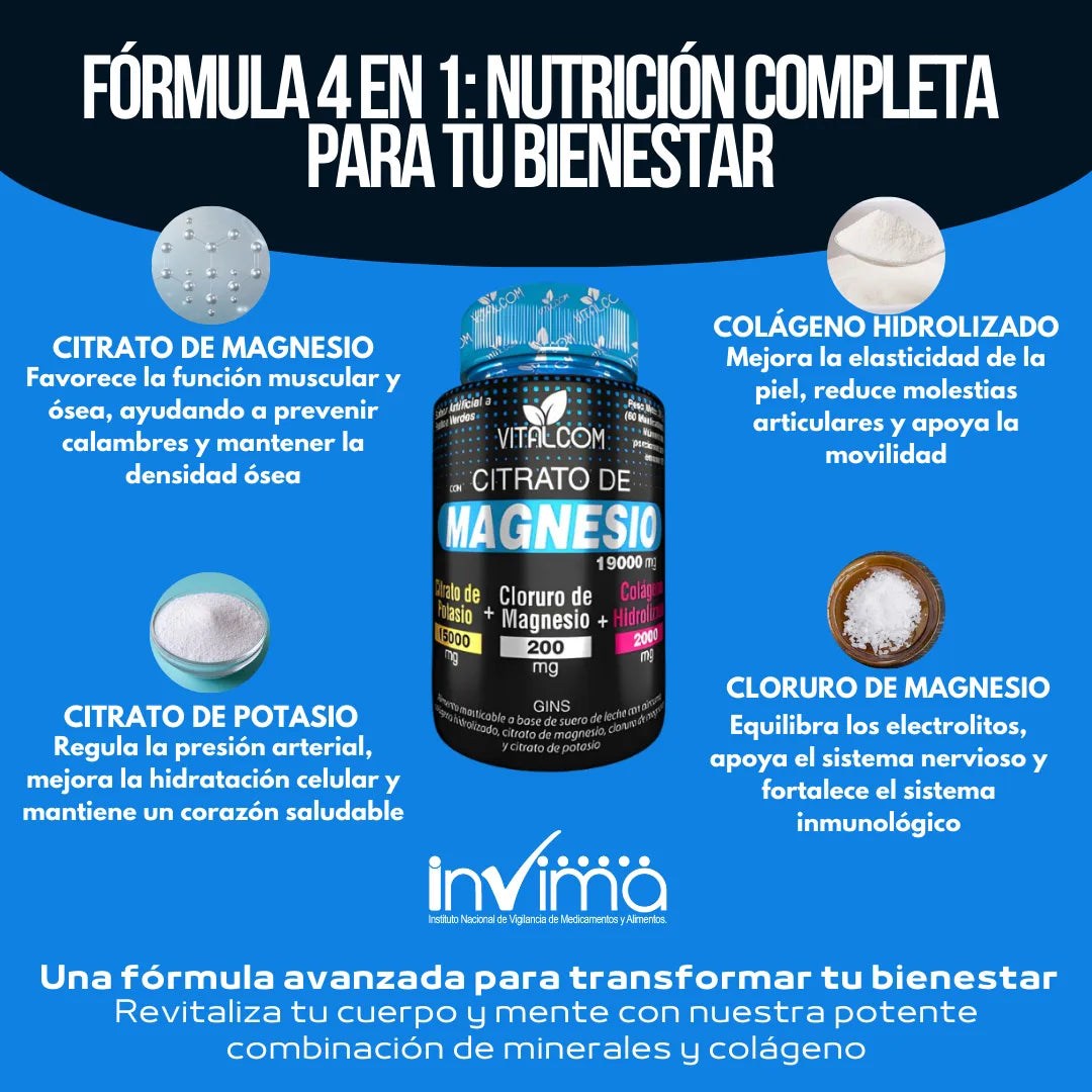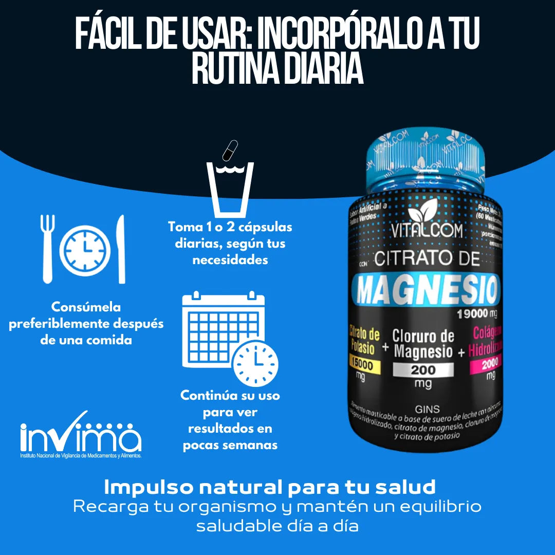 El citrato de magnesio es una de las formas más recomendadas por su alta biodisponibilidad, lo que significa que tu organismo lo absorbe con mayor facilidad, permitiéndote sentir los beneficios en menos tiempo.
