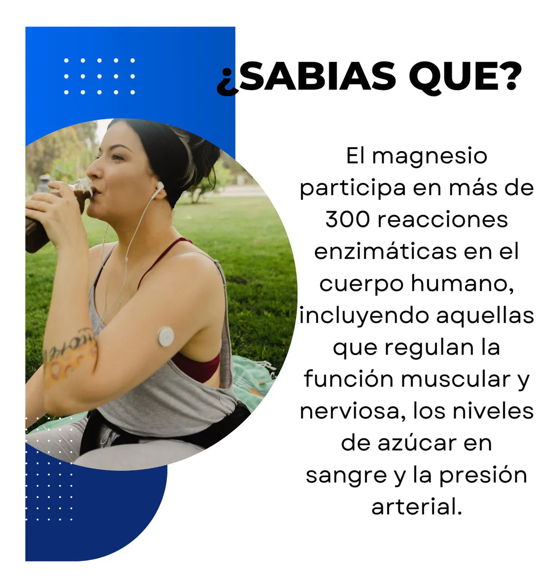 El magnesio es un mineral esencial que participa en más de 300 funciones en tu cuerpo: desde la producción de energía, la relajación muscular, el buen funcionamiento del sistema nervioso, hasta la calidad del descanso nocturno. El problema es que muchas veces la alimentación diaria no cubre los niveles necesarios, y ahí es donde nuestro suplemento marca la diferencia.